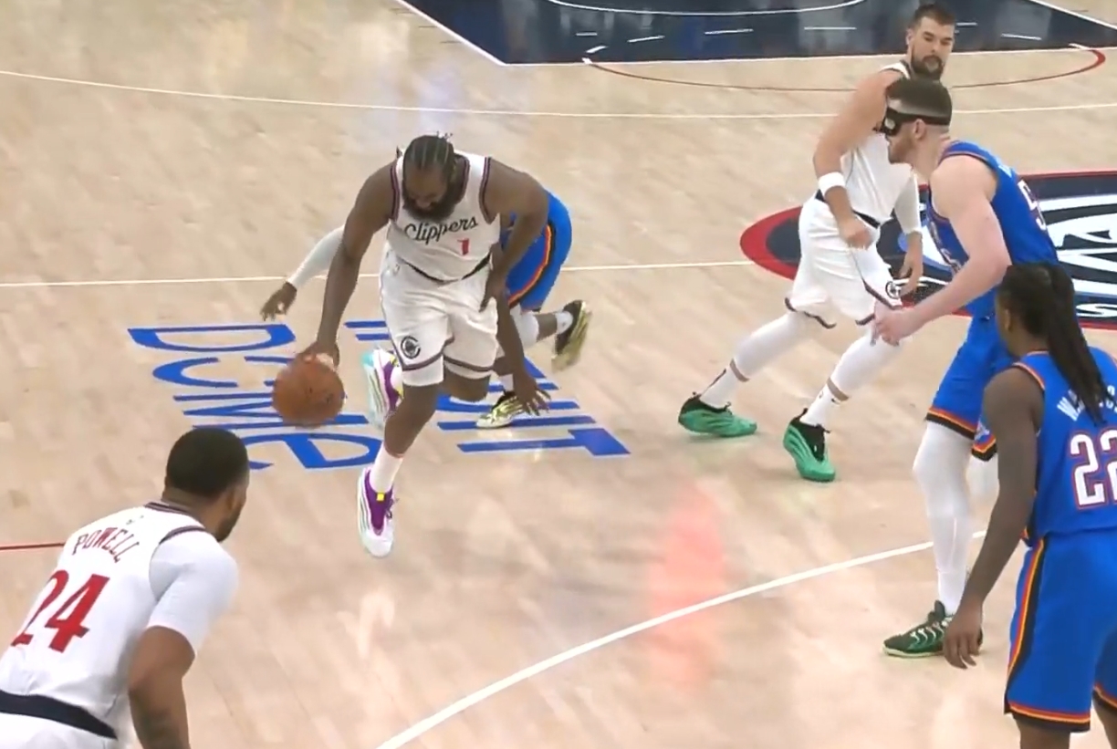 被多特贴身顶翻!哈登捂着自己的大腿痛苦倒地!好在无碍继续比赛